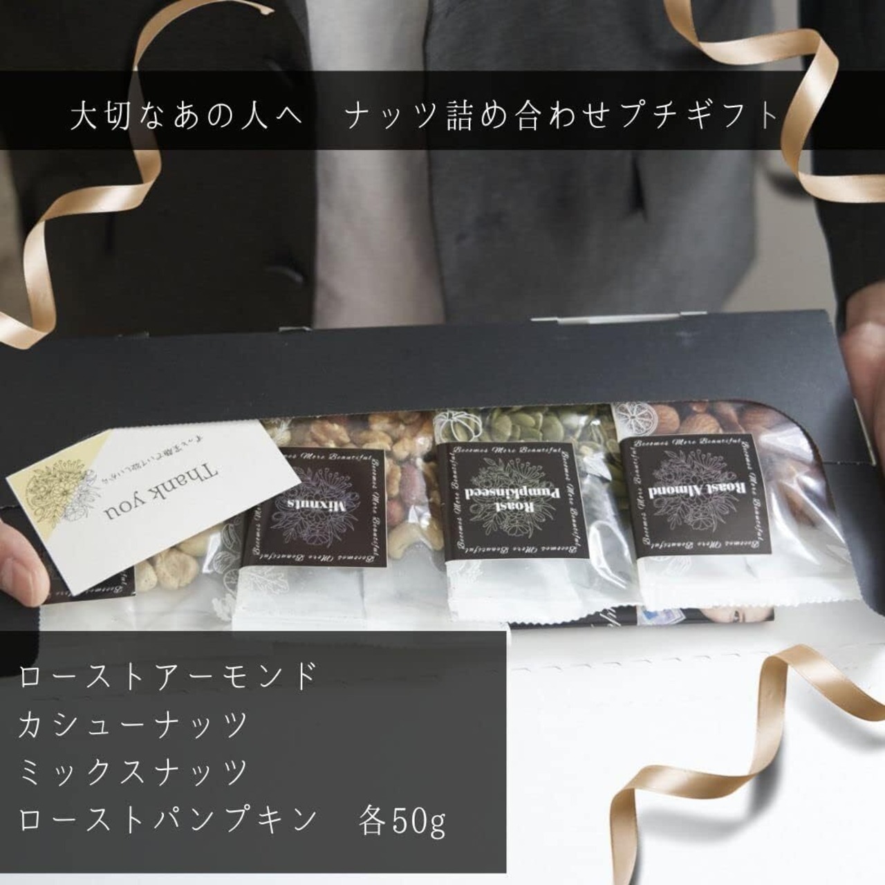 【ギフトセット】ナッツプチギフト。合計4種類になります。カシューナッツ・ローストアーモンド・ローストパンプキンシード・ミックスナッツ各50g×4袋。お酒のおつまみや、お茶うけ、ちょっと小腹がすいたときなどに丁度良い50gの小袋セット。 Thank youカード付き。バレンタインデーやホワイトデーのギフトにも! 職場や親せきのお土産やご挨拶にもお配りしやすい小袋のセットです。 賞味期限は箱底に表示。